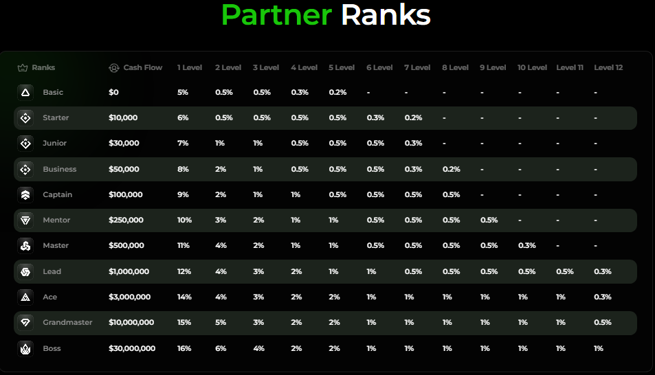 Multi-level Affiliate Program from 5% Up to 16% with rank bonuses up to $50,000
